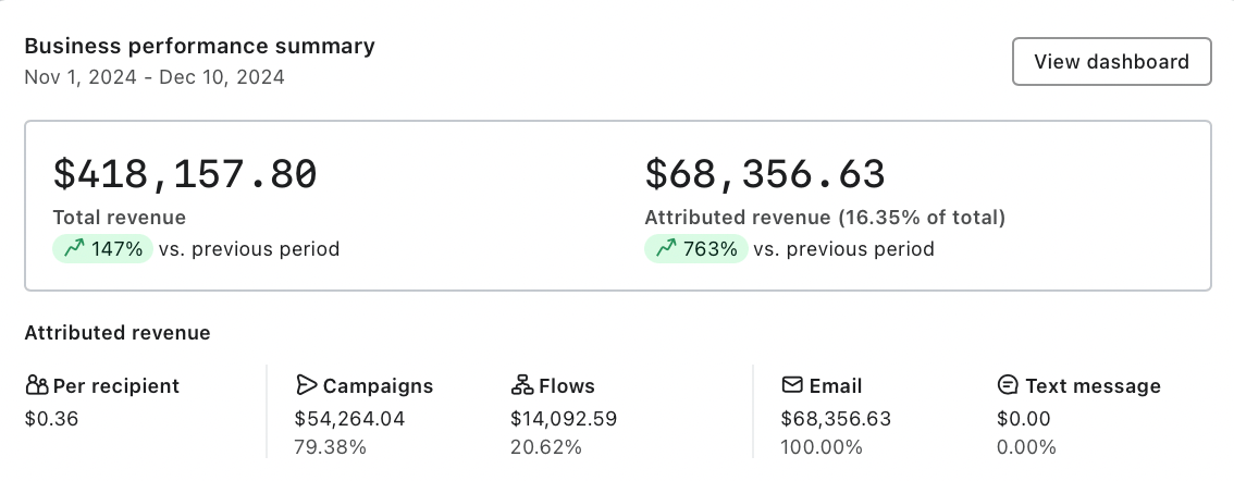 Flow revenue increased from $14,092.59 to $55,061.91, a 290% increase. This is where you really see the compound effect of optimization. Every improvement we made to their automated sequences throughout the year was paying dividends during their peak season.